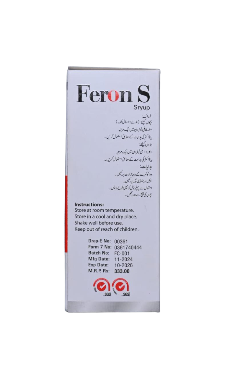 Feron-S is an Iron Bisglycinate-based syrup formulated to rapidly improve iron levels with minimal stomach irritation. Fortified with Vitamin C for enhanced absorption, it is ideal for children, adults, and pregnant women. Gentle on the stomach with superior absorption compared to traditional iron salts.