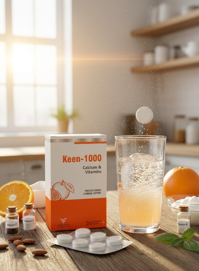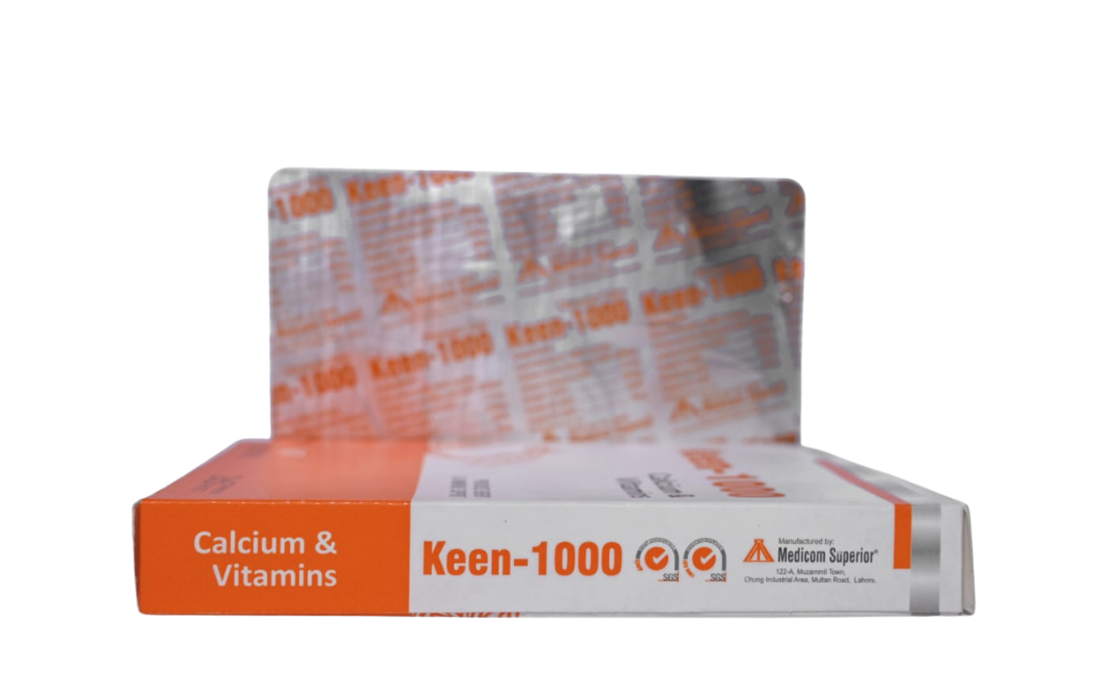 Keen-1000 is a high-potency calcium and vitamin formula designed to restore calcium levels and support bone, muscle, and nerve health. Enriched with Vitamin D3, Vitamin C, and B-complex, it helps improve bone density, reduce muscle spasms, and support immunity. Ideal for individuals with hypocalcemia, osteoporosis, and pregnancy-related calcium deficiency.