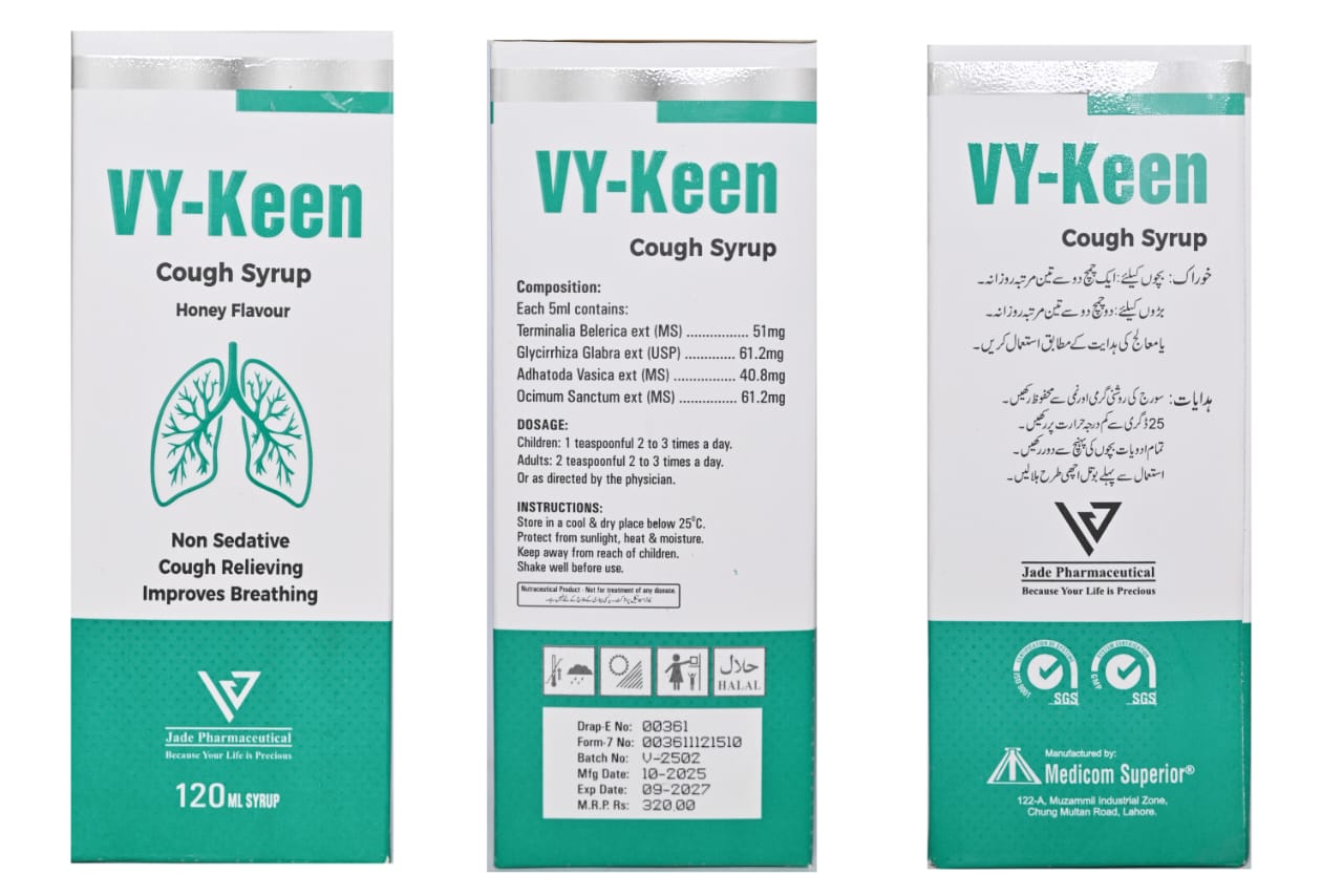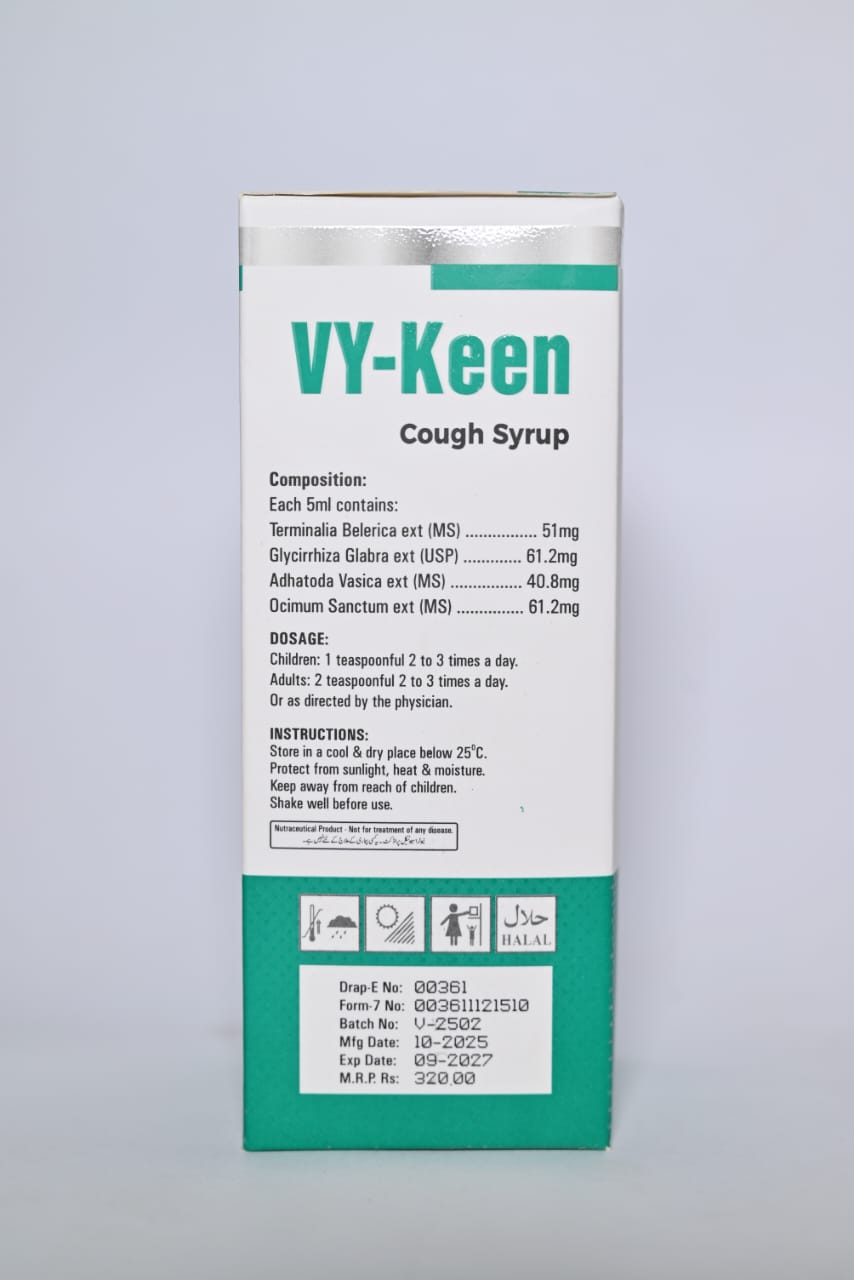 Vy-Keen is a herbal cough formula designed to provide relief from chronic cough, respiratory inflammation, and congestion. It contains natural extracts that soothe the throat and support respiratory health.
